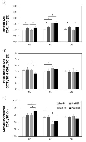 Measurement of erythrocyte composition: (A) the percentage of reticulocytes, (B) the percentage of stress reticulocytes, and (C) the percentage of mature erythrocytes. NE, normoxia training group; HE, hypoxia training group; CTL, control group; Pre, pretraining; Post, post-training; Rt, at rest; HET, immediately after HET; * p < 0.05, Rt vs. HET; † p < 0.05, pre vs. post. Values are the mean ± SEM.