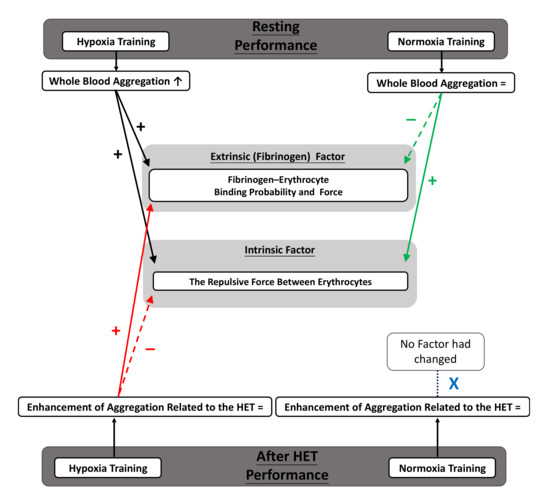 Possible mechanism of the present study. After training, the HET-related aggregation level was not altered in either group; however, after HE, the resting aggregation was significantly augmented via enhancements in both intrinsic and extrinsic response. In contrast to HE, NE elevated the intrinsic aggregability but also diminished the affinity between erythrocytes and fibrinogen. Solid line: enhanced effect; Dashed line: diminished effects.