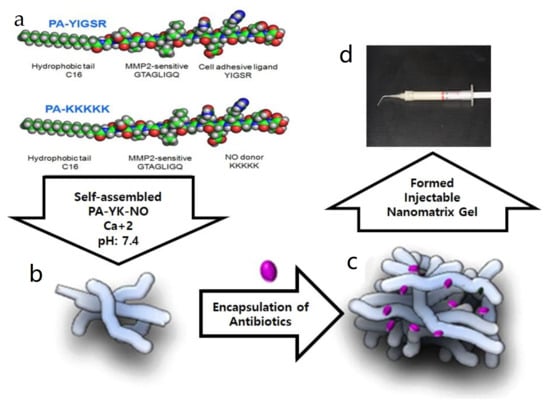 A biomimetic nanomatrix gel is formed by self-assembled peptide amphiphiles (PAs), which consist of a hydrophilic functional peptide sequence attached to a hydrophobic alkyl tail [25]. They can be easily synthesized and are chemically stable. In addition, they can form a viscoelastic gel by themselves in certain circumstances [25,26]. This gel can be used to trap and/or isolate cells, support their growth, and provide them with a controlled environment mimicking natural ECM. Several studies have reported the promising potentials of PAs as a biomaterial for use as a drug delivery system, including for NO molecules [19,20,21,27].