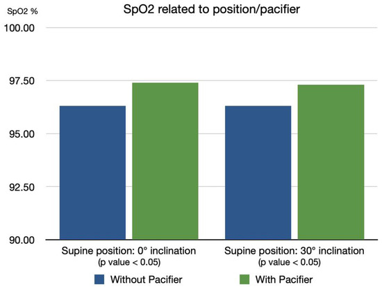 The average SpO2 reading in the supine position at 0° inclination was 96.3 (±2.1) and 97.4% (±2.0) without and with a pacifier, respectively. In the supine position at 30°, the average SpO2 reading was 96.3 (±2.2) and 97.3% (±2.1) without and with a pacifier, respectively. In the trials with a pacifier in the supine position at 0°, an improvement in the average SpO2 of +1.1 percentage points was found for all the patients. In the sitting position/at 30° inclination, the average SpO2 improved by +1.0 percentage points compared to the trials conducted without a pacifier, and this difference was statistically significant (p value < 0.05) (Figure 1). A significant improvement of +1.1 percentage points was recorded in the average SpO2 with a pacifier at 0° inclination compared to no pacifier at 30° inclination/in sitting position. The average SpO2 improved by +1.0 percentage points with a pacifier at 30° compared to no pacifier at 0°.