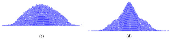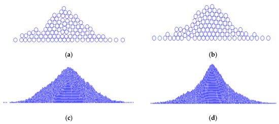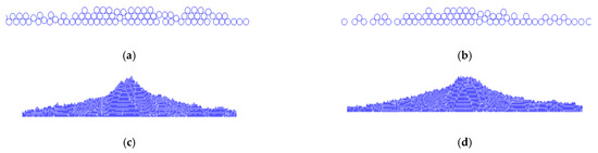 Rolling friction is fundamental in the studies of granular materials heap formation. Without rolling friction, it is impossible to have a stable pile with spherical or circular particles [34]. However, our simulation pointed out that a high value of the sliding friction coefficient can cause a small pile formation with the absence of rolling friction (Figure 5c). Figure 5, Figure 6, Figure 7 and Figure 8 show the simulation results without rolling friction, with rolling friction using model A, model B, and model C, respectively, with 100 and 2500 particles. The wet particles simulations are performed using a liquid volume equal to . We notice that we have heaps similar to experimental tests only with models A and C. Without the rolling friction, we have no other mechanical force stopping the particles from rolling away. As a result, we have no significant heap and some particles run out of our visualization domain (Figure 5). The particle system’s density combined with the high sliding friction coefficient explains the small pile in Figure 5c,d. In contrast, with a low sliding friction coefficient or a small number of particles, we would have no heap formation (Figure 5a,b).