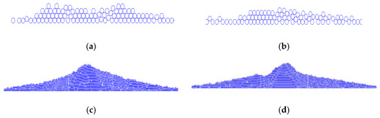 Dry (a,c) and wet (b,d) coarse soil heap formation with Model C with 100 particles (a,b) and 2500 particles (c,d).