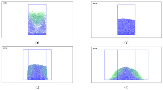 Simulation phases with 2500 particles: (a) the initial phase after the collision of the particles with the bottom wall. In (b), particles reach a static equilibrium before the opening of the walls. (c) particles enter the dynamic phase. Finally, in (d), the particles flow to reach the final static equilibrium state shown in Figure 7c.