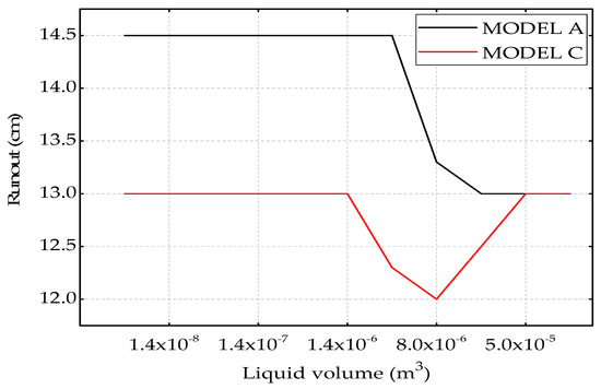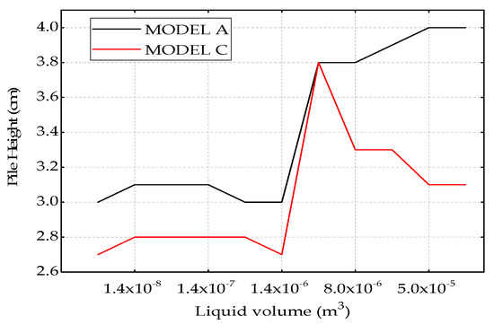 With the two models, our simulations showed a different behavior on both sides of a threshold liquid content equal to (liquid volume equal to 5 . With model A, from the threshold value, the pile increase with the liquid volume until the maximum asymptomatic value of 4 cm is reached. For model C, this value gives us a peak of heap equal to 3.8 cm. Then the height decreases with larger liquid volume until an asymptotic value of 3.1 cm. Figure 10 shows the pile height obtained with models A and C with different liquid volumes. The presence of asymptotic behavior for increasingly higher water contents is a common phenomenon reported in various tests with spheres or discs (column collapse, shear strength curves of unconfined radial and axial compression tests, and direct shear tests [18]).