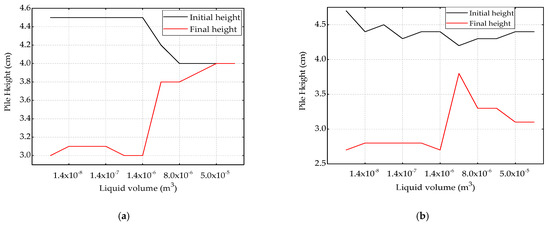 Initial and final pile height variation with the liquid volumes with models A (a) and C (b).
