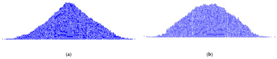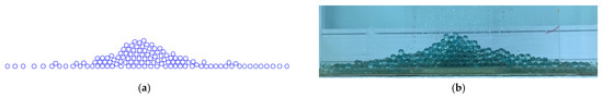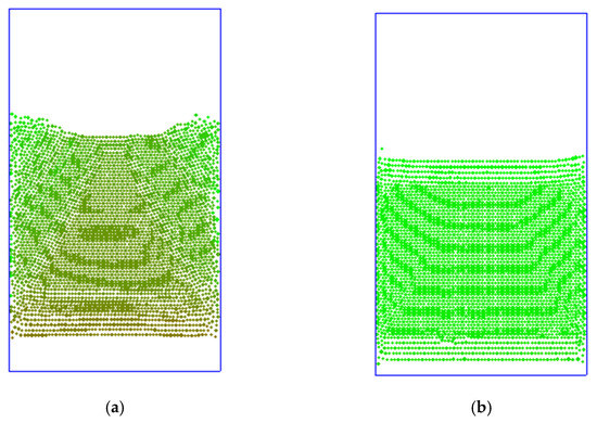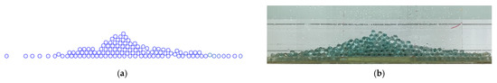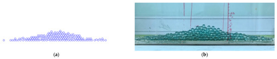 In DEM, we usually use heap formation experiments to calibrate the numerical simulation models [12,13,14]. This method allows researchers to ensure the accuracy of the input parameters and the simulation results. The particle properties are not easy to determine experimentally. Two types of calibration are used. In direct calibration, the simulation is calibrated by empirically measuring the particle properties and then using them as the simulation inputs. In reverse calibration, a bulk property is measured, such as the distribution of particle size, bulk (packing) density, and repose angle. Then, a set of simulation parameters is changed until the measured bulk properties are matched [15]. However, the microscopical and macroscopical behavior of the particles during heap formation simulations involving a dynamic phase are not totally understood.