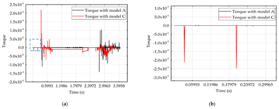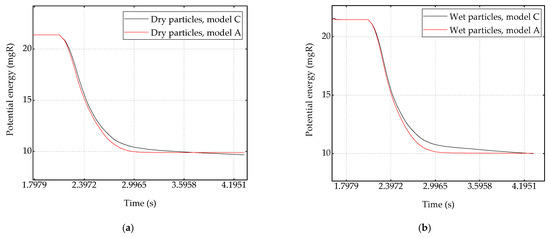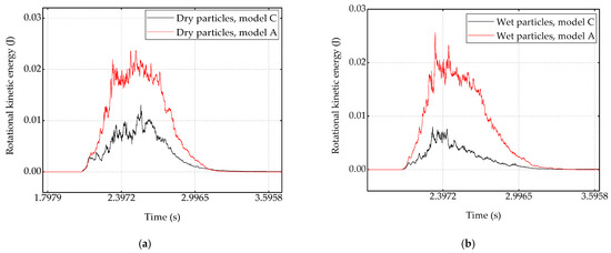 With a comparative graph as in Figure 26, we note that model C has lower kinetic energy than model A both in dry and wet particles simulation. In both simulations, model C appears to be more suitable for reducing the system’s kinetic energy even though, in our simulation, we eliminated the dissipation by viscous damping when the spring torque reaches the limit value. This is due mainly to its ability to stop the particle circular motion when rolling on a wall, as discussed in Section 3.3. Moreover, by preventing the hysteresis phenomenon, the damping part of the torque decreases the kinetic energy. With model A, there is no damping mechanism in the friction torque. The loss of kinetic energy will only result from the frictional damping effect.