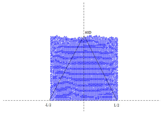 This study is based on DEM proposed by Cundall and Stark [4]. The Newton second law defines each particle’s movement, and particle motion is the result of its interaction with neighboring particles or walls and the action of other external forces. With an appropriate time step, all forces and torques can be determined from the interactions between the particle and its immediate neighbors [23]. We selected a time step equal to 0.01 of the critical time step which depends on the normal stiffness, the damping coefficient, and the particle mass [6].