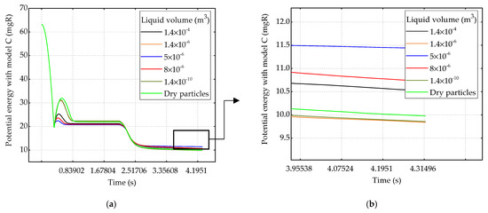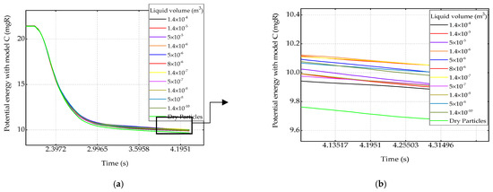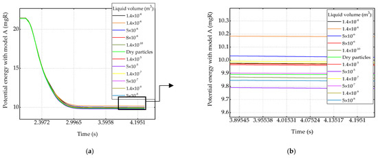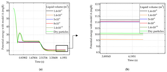 Comparative potential energy for dry (a) and wet (b) particles in case B simulations after removing the walls. The wet particles simulation was done with a liquid volume equal to 5 .