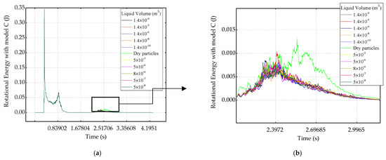 Comparative rotational kinetic energy for dry (a) and wet (b) particles in case B simulations (liquid volume 5 ).
