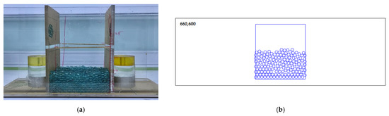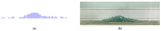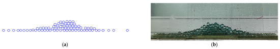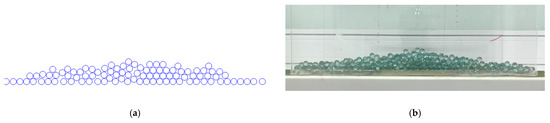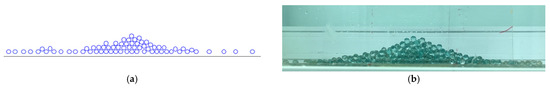 We performed experiments in the laboratory using glass beads for the validation of our model. Our study using a macroscopic approach of DEM, we validate our results by comparing the heaps obtained by simulation and experiment. The front and rear walls are totally fixed, and particles can only flow in the lateral direction giving a prismatic heap. To have a concordance of dimensions, we use the projection on the front wall of the result from our experiment, which can be compared with the simulation result [40,41]. This is done by taking our photos from a frontal and perpendicular point of view. For the experiment with 2400 particles, the particles are arranged in 16 × 10 × 15 inside the confining box. 16 represents the number of particles in the horizontal direction, 10 the number of particles in the vertical direction, and 15 the number of particles in the third dimension. Thus, considering the vertical plane section, we get 16 × 10 particles that we will consider for our 2D simulation. In all the experiments, the number of particles in the third dimension does not change.