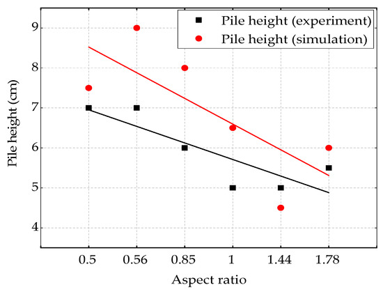 Pile height obtained with experiment and simulation versus the packing aspect ratio.