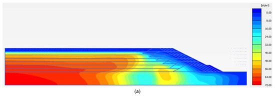 Figure 7 shows the excess pore water pressure at the last construction stage (filling rate of 2.5 m/year and rockfill width of 20 m). There was a relatively high excess pore pressure in some zones beneath the dikes after the raising phase R5 (Figure 7a). However, this pressure decreased significantly after the consolidation phase C5 (Figure 7b). The remaining high excess pore pressure after the consolidation phase C5 occurred in the lower part of the impoundment but further away from the dam. This is due to the presence of the impermeable base in the finite element model. The trend of the excess pore water pressure distribution observed in this study is similar to that reported by Ormann et al. [7] and Saad and Mitri [14], i.e., larger remaining excess pore pressure after a consolidation phase occurred in the lower part of the impoundment but farther away from the dam.