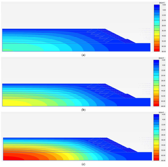 Figure 9 shows excess pore water pressure after the last consolidation phase C5 with respect to the pond filling rates. For the ease of interpretation, the shading views of excess pore water pressure in Figure 9 are fixed at the same color intervals, except for the model with the pond filling rate of 10 m/year. As shown, an effect of the pond filling rate on excess pore water pressure was discovered: an increase in pond filling rate can lead to an increase in excess pore water pressure in the model. In particular, the maximum excess pore water pressure in the model with the pond filling rate of 2.5 m/year was 29 kPa. This value rose up to 43 kPa, 68 kPa, and 138 kPa in the models with the pond filling rates of 3.3 m/year, 5.0 m/year, and 10 m/year, respectively. In cases of high pond filling rates, there was less time for the excess pore pressure to dissipate during consolidation.