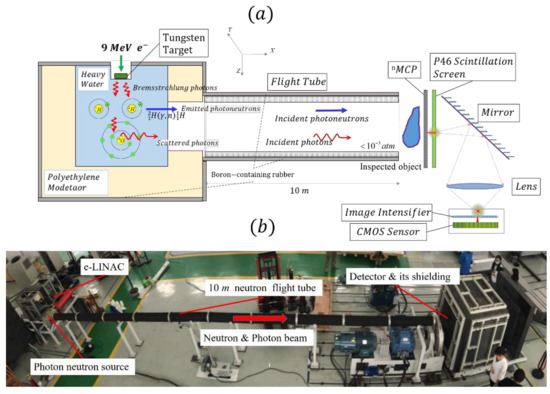 (a) The principle to produce imaging neutrons and photons simultaneously. Energetic electrons are delivered by a 9 MeV e-LINAC and bombard the tungsten target to produce bremsstrahlung photons. The bremsstrahlung photons then hit the 2H nuclei to produce the photoneutrons via the 2H(γ,n)1H reaction and the electrons surrounding the 16O nuclei to produce scattered photons, respectively. Both the neutrons and photons will penetrate the inspected object and be collected by a neutron-sensitive microchannel plate (nMCP) detector and converted to electron clouds, leading to a scintillation on the scintillation screen and formation of the photon and neutron images successively. A complementary metal oxide semiconductor (CMOS) camera then registers the two images with the aid of an optical system composed of the mirror and lenses. (b) Photograph of the bimodal imaging system driven by a 9 MeV e-LINAC.