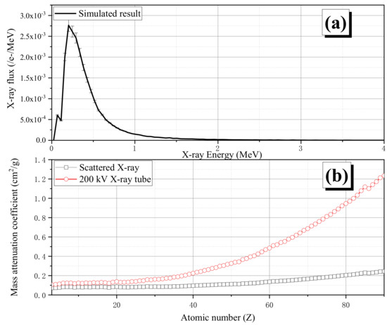 (a) The simulated spectrum of photons along the 90° direction for photon imaging. (b) Mass attenuation coefficients of 90° scattered X-rays (“□”) and 200 kV X-rays (“○”).