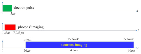 Although imaging photons and neutrons produced by the bremsstrahlung photons share the same imaging geometry, their imaging processes’ interference should be considered. As e-LINAC works at a pulse mode of 5 μs duration and a 100 Hz repetition rate, the photon flight time from the heavy water converter to the detector is merely 5.033 μs, in which the 5 μs is the pulse width of photons and the 0.033 μs is the photon’s flight time across 10 m. Considering the decay time for the light emitted by the scintillation screen is 0.2 μs, in order to let the photons’ influence on the detection system die away, an additional time delay of 2 μs after the last photon bombarding the nMCP detector (Appendix A.5) should be set for the photon imaging and before triggering the acquisition of neutron imaging. Therefore, in principle, the duration of (7.033 μs, 10 ms) after each electron pulse can be assigned to neutrons for neutron imaging. In the experiments, we chose (50 μs, 9.95 ms) as the duration for neutron imaging to avoid the mutual interference between the two imaging processes. The thermal neutrons used for neutron imaging have a characteristic speed of 2200 m/s and require 4.5 ms for the 10-meter flight. Thus, both the photon imaging and neutron imaging can be perfectly accommodated by the (33 ns, 7.033 μs) and (50 μs, 9.95 ms) durations, respectively, as shown in Figure 4. Neutrons with energy smaller than 5.2 meV might be detected in the next period and cannot be temporally separated from the next X-ray pulse, their influence on the X-ray imaging can be neglected due to the number of cold neutrons, which are unintentionally delivered by the room-temperature moderator and measured within the 5-microsecond duration, is far smaller than that of the X-rays.