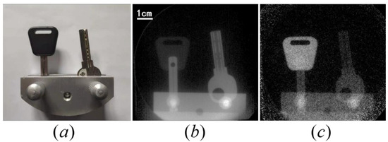 (a) The photo of the clamped keys; (b) the photon image of the keys; (c) the neutron image of the keys. (Measuring time is 30 min).