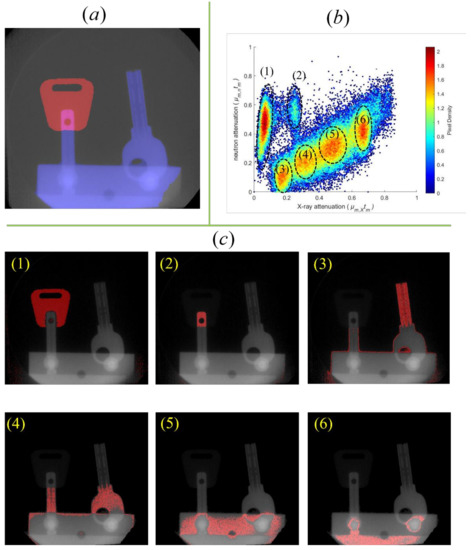 (a) The image fused from the neutron image and photon image; (b) the material identification based on the information from neutron attenuation and photon attenuation; (c) The six clusters in (b) are related to different zones of the inspected object, as shown in (1) to (6). Pixel density is the number of pixels in the area of 0.0075 μt × 0.0075 μt.