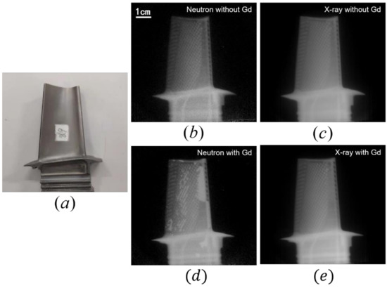 (a) The photo of an inspected turbine blade; (b) the neutron image and (c) the X-ray image of the blade without gadolinium tracer; (d) the neutron image and (e) the X-ray image of the blade with gadolinium tracer (Measuring time is 60 min for each pair of imaging).