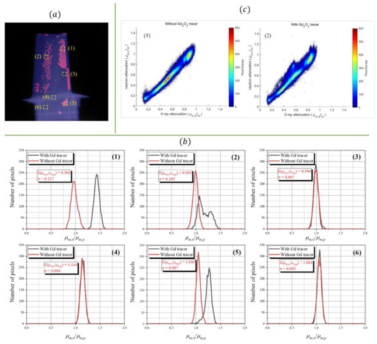 (a) Fused image of the turbine blade; (b) the distributions of μm,n/μm,X for turbine blades with or without gadolinium tracer, for six different positions of the turbine blade (selected region is 40 × 40 pixels); (c)(1) the bivariate histograms for turbine blades with gadolinium tracer and (c)(2) without gadolinium tracer. Pixel density is the number of pixels in the area of 0.0075 μt × 0.0075 μt.