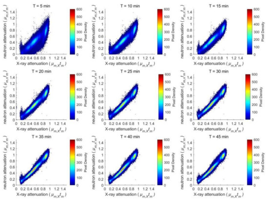 Figure 10 presents the bivariate histograms of the inspected turbine blade with various measurement times. As the turbine blade made of nickel is free of a gadolinium tracer, in principle the slope (Appendix A.6), which is the ratio between μm,ntm and μm,Xtm in each histogram, should be a certain value. However, the statistical error contaminates the results and spreads the two-dimensional distributions in the histograms. The value of the slope in the bivariate diagram is as follows: