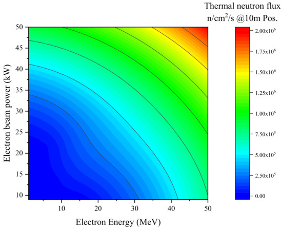 Thermal neutron flux at the detector’s position 10 m away from the photoneutron source, with the varied electron energies and beam powers.