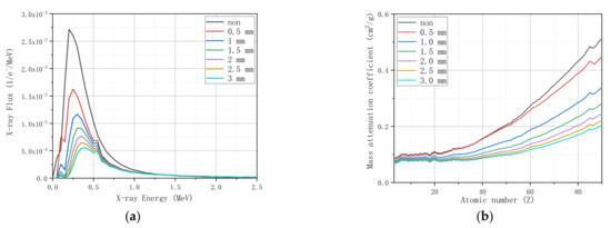 The spectra of photons and neutrons would undergo the hardening process when they penetrate inspected objects of various mass thicknesses. Therefore, the ratio between the neutron attenuation and photon attenuation might not be constant even for a particular material. Although the hardening effect cannot vanish completely, it can be somewhat alleviated when a high-Z material layer is used to tailor the penetrating X-rays’ spectrum. Shown in Figure 12a,b are the spectra and average mass attenuation coefficients for the X-rays, respectively, when a lead layer of various thicknesses is placed at the exit of the photoneutron source to shield the low energy photons via the photoelectric absorption and the high energy photons via the pair production. The mass attenuation coefficients for the elements with Z < 50 can be deemed as constant when a 3-millimeter-thick lead layer is used, indicating that Compton scattering is now the dominating photoatomic reaction and the spectrum of X-rays will stably stay within the MeV region, where the hardening effect for photons is not significant.