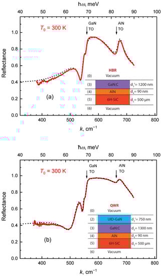 Reflectance of the samples, HBR (a) and QWR (b), at room temperature. Wavenumbers and corresponding photon energies are denoted as k and ħω, respectively. Solid lines represent experimental data. Dashed lines demonstrate results of the spectra fitting at the best-fit parameters. Inset in panel (a) demonstrates the multi-layer model used for the spectrum simulation for the QWR sample. Inset in panel (b) shows the model used for the HBR sample. The numbers in brackets indicate the layers of the model described in Section 4.
