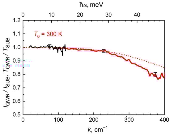 Next, we investigated the relative spectrum of UID GaN, GaN:C buffer and AlN nucleation layers measuring the intensities IQWR and ISUB at the output of the QWR and SUB samples, respectively. The IQWR/ISUB ratio spectrum is shown in Figure 4. It was considered as a characteristic transmittance of the stack of all three layers. The theoretical spectrum was also found modeling the ratio of TQWR/TSUB, here TQWR is the transmittance of the QWR sample calculated using the best-fit parameters modeling the reflectance of the HBR and QWR samples. The model for the transmittance TSUB of the 6H-SiC substrate (sample SUB) was described in Section 4.