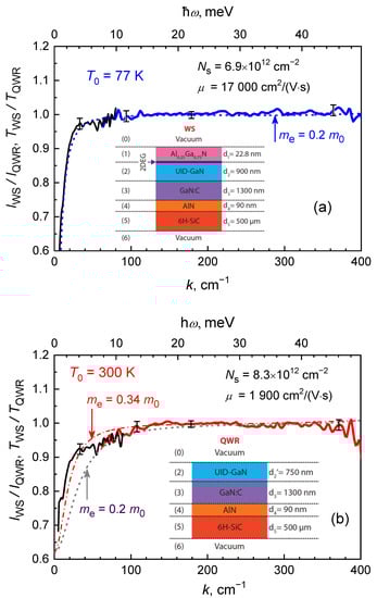 Modelled relative spectrum of TWS/TQWR ratio was also calculated. The results are shown in Figure 6. Simulation was performed with the help of Equation (13) using a common value of the electron effective mass  [] and corresponding 2DEG parameters measured for our HEMT structures in the Hall experiment (Table 1). At the temperature of 77 K, the theoretical simulations are in a good agreement with experimental results (Figure 6a). The main feature in the transmittance spectrum is the monotonic amplitude increase with the increase of incident photon energy visible up to 15 meV. This steep shoulder is a fingerprint of free carrier absorption due to high-frequency Drude conductivity of 2DEG in AlGaN/AlN/GaN HEMT structures.