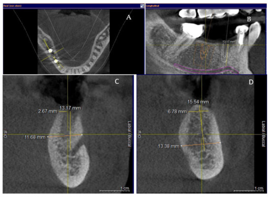 (A,B) Pre-operative CBCT aspects. (A) Narrow residual alveolar ridge. (B) Analysis of the mandibular nerve position. (C,D) Pre-operative CBCT aspects (cross-sectional).