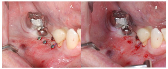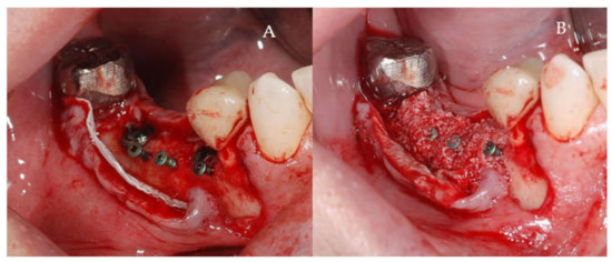 (A,B) Intra-operative clinical aspects. (A) Clinical aspect of the inserted implants and osteosynthesis screws. (B) Clinical aspect of the graft material and collagen membrane placed to delimit the future bone regeneration compartment.
