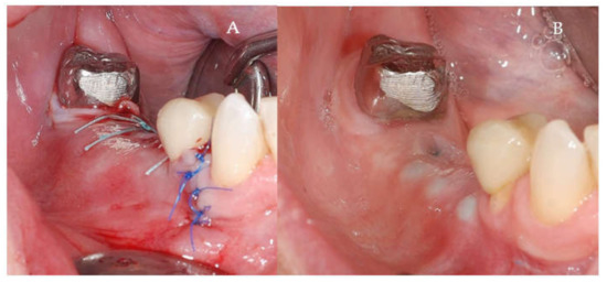 (A,B) Follow-up of the S-GBR surgery. (A) Tension-free sutures. (B) Clinical aspect at 7 months post-surgery.