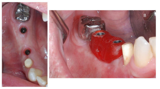 (A,B) Post-operative clinical aspects 3 weeks after second stage surgery. (A) Healthy peri-implant soft tissues (B) The repositioning key of abutments.