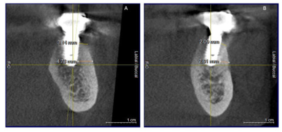 (A,B) CBCT aspects (cross-sectional) of osseointegrated implants at 24-months follow-up.