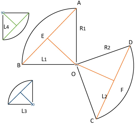 The intersection of the vertical bisector of the line segment L1, L2 is detected as the center of the circle O. Assume that R1 and R2 are the distances from O to the pair of line segments {L1, L2}, respectively. If the radial distance tolerance is satisfied, the radius R is the average value of R1, R2. Therefore, we have the following:
