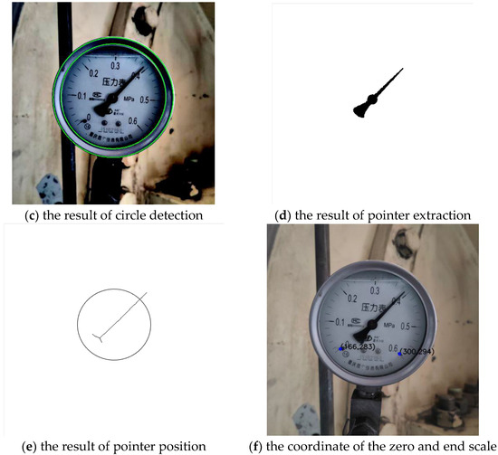 Figure 6a is the original pointer gauge image. From Figure 6a, it can be seen that the contrast of the image taken under natural light is not high, especially the blurred pointer of the scale line leads to a position inaccurately. For the experiment of center extraction and pointer positioning, the numbers and words in the dial interfere with the next detection. Therefore, this paper proposed a recognition reading algorithm based on coordinate positioning. Firstly, the MSRCR algorithm was used to reduce the influence of light and improve the contrast of the scale line. Then, the center and pointer were directly extracted based on the image information, which greatly reduced the influence of other useless information in the background. Figure 6b is an enhanced image of MSRCR. It can be clearly found that the scale line is clearer, which is beneficial to the next pointer extraction experiment. Figure 6c shows the result of the circle center extraction. Although the extraction result obtained the inner and outer contours of the dial, it did not affect the location of the center of the circle. Figure 6d–f shows the pointer obtained by using the difference between the template and the original image, and then refined the pointer to draw a circle with an appropriate radius. The coordinates of the positioning pointer were determined by the intersection of the specified circle and the refined pointer. When drawing a circle, in order to reduce the deviation caused by incomplete pointer extraction, the radius of the circle should be increased as much as possible under the premise of ensuring that it can intersect with the refined pointer. This is because the radius of the selected circle is proportional to the distance from the intersection to the scale line. The larger the radius of the circle was, the higher the accuracy of the reading was. Figure 6f shows the obtained coordinates of the initial scale value. Finally, the pointer reading was obtained using the angle method.