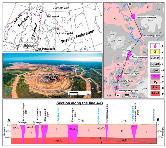 The Lomonosov diamond deposit of the Arkhangelsk diamondiferous province is located ~90 km northeast of Arkhangelsk, forming a chain about 20 km long with a strike north–north-east. The deposit consists of six kimberlite pipes: Arkhangelskaya, Karpinsky-1, Karpinsky-2, Pionerskaya, Lomonosovskaya, and Pomorskaya (Verzhak et al. 2008). Currently, only two pipes (Arkhangelskaya and Karpinsky-1) are being developed by quarries. The location and geological structure of the Lomonosov diamond deposit is shown in Figure 1.
