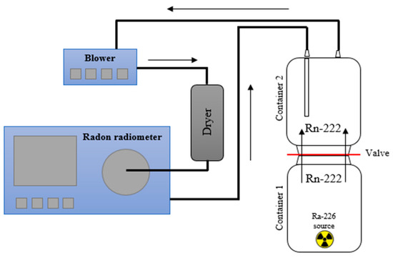 where λ is the decay constant of radon. The experimental facility for assessing radon leakage is shown in Figure 2.