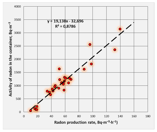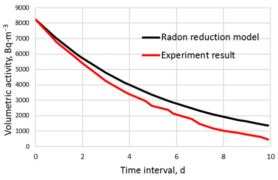 The decrease in radon activity in the experimental model is shown in the Figure 3. This process occurs due to radioactive decay, as well as radon leakage through the container. The average value of the level of radon leakage was 9.02 ± 0.28%·10−7 s−1.