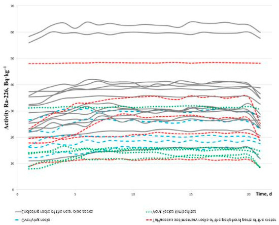 To establish the equilibrium of all members of the 226Ra series in the samples of the studied rocks, a time interval from 5 to 10 days is sufficient (Figure 4). When carrying out further studies with rocks of other types, we consider it possible to reduce the measurement period to 15 days.
