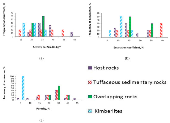 Histogram of radium activity (a), emanation coefficient (b) and porosity (c) for the studied types of rocks.