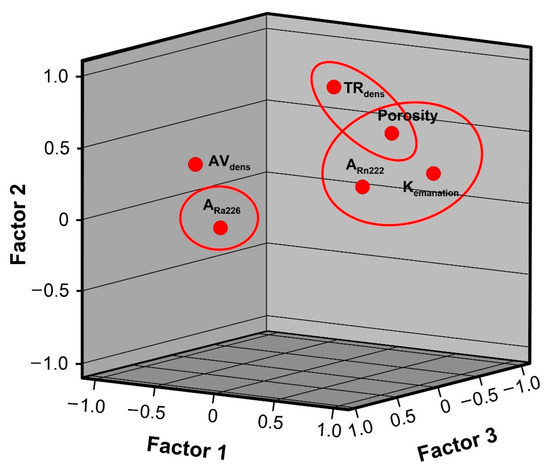 The first factor, with a dispersion of 52.81%, includes the radon emanation coefficient, the volumetric activity of radon in the counting sample and the porosity of the sample. This is due to the fact that these parameters are the main parameters in the process of forming a radon field. This conclusion was made in the conditions of the experiment and does not take into account other physical factors that can affect the behavior (gas permeability, humidity, temperature, pressure). The same parameters are involved in calculating the level of radon production.