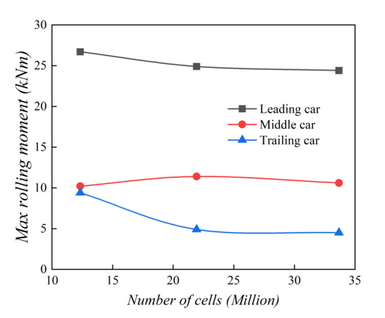 Figure 7g–i. Here, the combination of the side and lift forces shows a different law of overturning moment: a default posture increased the overturning moment of the leading car, while weakened that of the middle and trailing cars. According to
