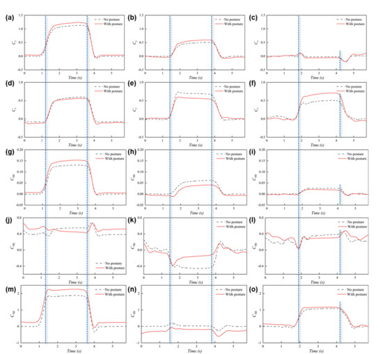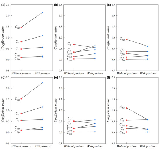 Figure 7 shows the time-varying aerodynamic coefficients of each car during the train’s run, from 100 m before the crosswind region to 100 m after the tail car exits. The speeds of the train and the crosswind were 83.33 m/s and 20 m/s, respectively, giving a yaw angle of 13.5°. The time points when the corresponding car entered and left the crosswind region were given in each figure to explore the transient influence of the crosswind on the aerodynamics of the train. The results of the train with and without the consideration of posture were included in each figure to compare the aerodynamic differences. The range of the coefficient values of the sub-figures was maintained to facilitate the analysis of the different performances among various aerodynamic coefficients. The peak-to-peak value of the aerodynamic coefficients obtained when each car of the train entered and left the crosswind region was also calculated and shown in
