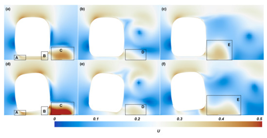 Figure 9b,e, most of the flow fields around the vehicle body are similar, only the D area (the same as the C area in