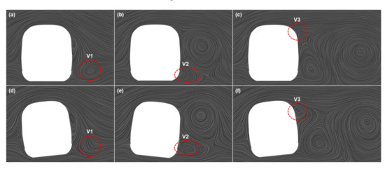 Figure 9a,d) produced a different shape for the high-speed area, which is attributed to the additional vortex (V2 in