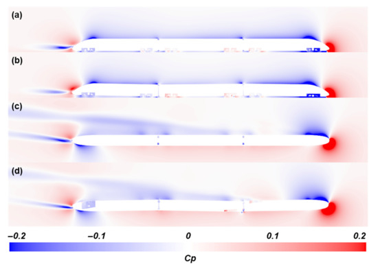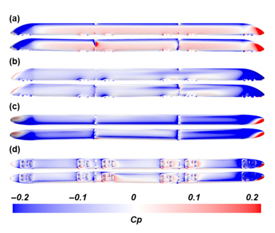 Figure 11a,b, the pressure distribution on the symmetry plane of the train was almost unaffected by the posture change, and only the near-wake area had a relatively obvious difference, where the streamlined structure of the trailing car of the train with posture bore large positive pressure, and smaller negative pressure was found in the center of the wake plume flow. An even smaller difference was found in the pressure distribution pattern on the horizontal plane, seen in