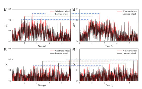 As trains passed the crosswind region, the DC values on these two wheelsets showed different performances. After the first wheelset of the leading car entered the crosswind region, the DC value began to rise and fluctuated at a high level. When it left the crosswind region at about